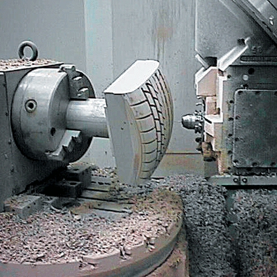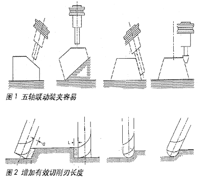 由于使用五軸聯(lián)動機(jī)床,使得工件的裝夾變得容易(圖1)。加工時無需特殊夾具,降低了夾具的成本,避免了多次裝夾,提高模具加工精度。采用五軸技術(shù)加工模具可以減少夾具的使用數(shù)量。另外,由于五軸聯(lián)動機(jī)床可在加工中省去許多特殊刀具,所以降低了刀具成本。五軸聯(lián)動機(jī)床在加工中能增加刀具的有效切削刃長度,減小切削力(圖2),提高刀具使用壽命,降低成本。