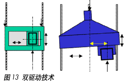 其次是采用雙驅(qū)動技術(shù)(圖13)。對于較寬工作臺或龍門架型式,如果采用中間驅(qū)動,實際無法保證驅(qū)動力在中心,容易造成傾斜,使得動態(tài)性能較差。使用雙驅(qū)動,雙光柵尺,一個驅(qū)動模塊,就能使動態(tài)性能非常完美。一個驅(qū)動指令,雙驅(qū)同時工作,光柵尺來檢測兩點是否平衡,如果不平衡則通過不同指令使其達(dá)到平衡。